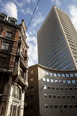 The loss of the Maison du Peuple was part of the trend of Brusselisation, where many historic buildings were torn down and replaced by skyscrapers. The Maison du Peuple itself was replaced by a 26-floor office building, the Blaton Tower, built in the year immediately after the Maison du Peuple's demolition by the Blaton family.[3]