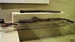 Wood is another important material. At Weidun site, a few large wooden objects were discovered. There are mainly two types, scull and oar. The scull was made by the crassitude log, and its length is 120 cm, while oar has the features of flat and half-ellipse shape with a handle, and its length is shorter than scull, which is ranged from 70 to 90 cm.[33]