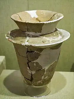 At Weidun Site, archaeologists discovered a huge number of pottery objects, include fu-cauldrons, guan-pots, ding-tripod, dou-stemmed plates, bo-bowls, and pen-basins, most of them were fine-clay ware, and some were tempered with shell or sand.[21]