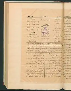 The Persian-language journal Majlis (Persian: مجلس, lit. 'Parliament / Assembly'; DMG: Maǧlis) was published in Tehran between 1906 and 1908. A total of 325 issues was edited in one volume.