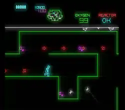 In the next phase, the player lands on the robot space station by centering the Catastrofighter in between the moving white line and Major Havoc would exit his ship and enter the space-station. The roller-knob controlled left and right character movement and a "jump" button permits the player's character to leap over obstacles. The object is to get to the core of the space station, sabotage the reactor, and escape to a minimum safe distance before the space station explodes. Red arrows point the direction going in and the word "OUT" appears on the arrows during escape to point the direction out. The levels get gradually more complicated and difficult to navigate as the player progresses. Upon a successful mission, the next space station becomes more difficult and the time allotted (both in and out) is decreased.