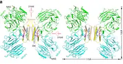 MRJP1 oligomer showing the H-like complex structure that contains four MRJP1 (green or cyan), four apisimin (yellow or wheat), and eight 24-methylenecholesterol (blue, purple, orange, or lime sticks) molecules