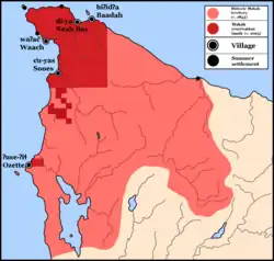 ![]() Makah territory (light red, c. 1855) overlayed with current reservation lands (dark red) | |