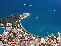 Makarska is a prominent regional tourist center, located on a horseshoe-shaped bay between the Biokovo mountains and the Adriatic Sea. The city is noted for its palm-fringed promenade, where cafes, bars and boutiques overlook the harbor. Adjacent to the beach are several large capacity hotels as well as a camping grounds.