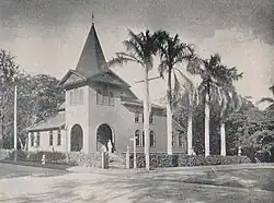In 1903, Takie Okumura, a pastor from Japan, left his congregation at the Honolulu Japanese Christian Church (now the Nuuanu Congregational Church) to start the Aiyū kai.[1] On April 8, 1904, Takie Okumura founded the Makiki Church, but there wasn't an actual building until a few years later. In 1905, George Castle, a local businessman, donated a plot of land to the church so that they could build the actual church, which was built in 1906. It could hold up to 500 people.[2]