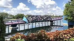 As guests go through the queue area, various educational displays and an additional Guy Harvey exhibit can be seen.[28] The queue of the ride consists of a wooden pier, where the riders are situated under while waiting.[29] During the queue, guests take on the point of view of a mako shark as it traverses through preying grounds.[28] The theme of Mako's station is a shipwreck.[26] Different sections of an original musical score is played throughout the queue and loading station, as well as the plaza area beneath the coaster's climactic loop.[30] SeaWorld commissioned the 32-minute score, which was composed and produced by Rick McKee.[30] Before the ride's train dispatches, a panel located above the riders shows scenes of shadowy figures consisting of a group of sharks migrating forward with accommodating visuals and sound.[29]