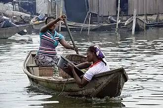 Makoko is an informal settlement across the 3rd Mainland Bridge located on the coast of mainland Lagos, Nigeria. A third of the community is built on stilts along the lagoon and the rest is on the land. The waterfront part of the community is largely harboured by the Egun people who migrated from Badagary and Republic of Benin and whose main occupation is fishing.