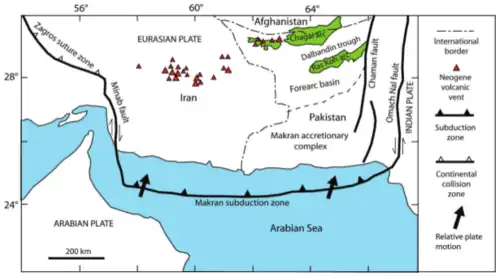 In the Makran region, the Arabian plate subducts beneath the Eurasian plate at ~2-4 cm/yr. This subduction is associated with an accretionary wedge of sediments which has developed since the Cenozoic.[1] To the west, the Makran Trench is connected by the Minab Fault system to the Zagros fold and thrust belt.[2] To the east, the Makran Trench is bounded by the transpressional strike-slip Ornach-Nal and Chaman Faults, which connect to the Himalayan orogeny. The Makran Subduction Zone is often split into two segments: the east and west. The Sonne fault divides the two.[3] Though largely much quieter than many other subduction zones, studies reveal that the Makran Trench may be capable of very large earthquakes, even extending into the magnitude 9 range.[4]