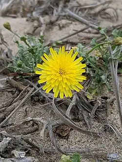 Malacothrix incana is an uncommon species of flowering plant in the family Asteraceae known by the common name dunedelion. This species is a mounding shrub with wooly leaves. It is endemic to California, where it grows only in sand dunes on the beaches of the Channel Islands and isolated spots along the mainland coastline in San Luis Obispo and Santa Barbara Counties. Malacothrix incana was first collected in San Diego, far south of its present range, but the plant is now extirpated from there.[3]