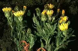 Malacothrix squalida is a rare species of flowering plant in the family Asteraceae known by the common name Santa Cruz desertdandelion. It is endemic to Santa Cruz and Anacapa Islands, two of the eight Channel Islands of California, where it grows on rocky seaside bluffs and cliffs. The plant is very limited in distribution and today exists only in degraded habitat on these two small islands. It was last collected from Santa Cruz Island in 1968, and two populations were noted on Anacapa Island in 1998; in drought years there may be no plants at all.[1][2] It became a federally listed endangered species in 1997. This is an annual herb growing a hairless, waxy stem 20 to 30 centimeters in maximum height. The leaves are sharply lobed. The inflorescence is an array of flower heads lined with oval-shaped phyllaries. The ray florets are 1 to 2 centimeters and light yellow in color.