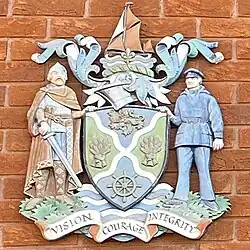 On the dexter side an Anglo-Saxon warrior holding in his dexter hand a sword point downwards and the sinister side a yachtsman habited in a sailing smock and wearing a peaked cap all Proper upon a compartment composed of a grassy mound also Proper divided by water barry wavy Argent and Azure.
