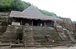 Detail of Mural at Divino Salvador in MalinalcoThe major attraction is the Cuauhtinchan Archeological Zone, located just west of the town center on a hill called Cerro de los Idolos, which rises 215 meters above the town.[23] On its sides are a number of pre-Hispanic structures built on terraces built into the hill. The main structures are at the top.[2] This is one of the most important Aztec sites and was discovered in 1933,[14] and explored by José Garía Payón in 1935.[8] The visible complex dates from the Aztec Empire but the site’s use as a ceremonial center appears to be much older.[8] The sanctuary complex was built from the mid 15th century to the beginnings of the 16th. To get to the Cerro de los Idolos one must climb 426 stairs up 125 meters.[13] Along the stairway leading to the site, there are signs with area’s history written in Spanish, English and Nahuatl. The site contains six buildings.[5] The Cuauhcalli or House of the Eagles, which dates from 1501,[24] is the main building, which is significant in that it is carved out of the hill itself.[14] The building is in the shape of a truncated pyramid,[25] built this way due to the lack of space on the hill.[2] The monolithic Cuauhcalli has been compared to the Ellora in India, Petra on the shores of the Dead Sea and Abu Simbel in Egypt.[8] This was a sanctuary for the Eagle Warriors for rites such as initiation.[14] A thirteen-step staircase leading into this temple is flanked by side struts.[8] and two feline sculptures that face the plaza in front.[25] The Cuauhcalli consists of two rooms, one rectangular and the other circular, with an opening in the wall between the two. After being carved out of the rock, the walls and ceiling were covered in stucco and painted with murals, most of which are almost completely gone.[2] In the upper part, the entrance is symbolized by the open jaws of a serpent, complete with fangs, eyes and a forked tongue, which was painted red.[8] This upper portion is covered by a thatched roof of the grass the area is named for.[25]