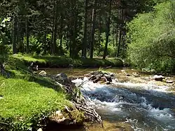 The river takes its source under the name Mrazliv Dol at an altitude of 1,716 m in the Momuna Voda locality in the Pereliksko–Prespanski Ridge of the western Rhodope Mountains, north of the Momchul Yunak refuge. It flows in a deep narrow valley in direction southeast until the village of Slaveyno, after which it turns south–southeast for the rest of its length. Near the village of Banite, the river passes through a small valley extension, after which its valley becomes canyon-like and difficult to access, with numerous meanders along the mountain slopes. It flows into the Arda at an altitude of 488 m some 2 km south of the village of Galabovo.[1] It drains the southeastern slopes of the Pereliksko–Prespanski Ridge.[1]