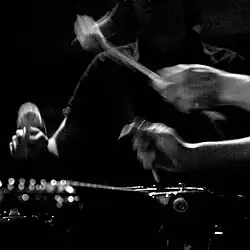Drawing on the guitar-based works of Rhys Chatham and Glenn Branca, but "downplaying the rock element to create a mixture of the band dynamic and a chamber ensemble," Duvall began experimenting with the idea of composing music entirely through striking electric guitars with mallets.[3] Such self-imposed limitations became a defining principle for the ensemble.