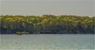 Over time, the shipwrecks of the "Ghost Fleet' have transformed into distinctive, skinny, vegetation-covered artificial islands which provide island, intertidal, and underwater habitats that support a diversity of coastal and marine life, including an abundance of fish, American beavers, and birds such as ospreys, great blue herons, and bald eagles.[10][11] Sediment and seeds deposited inside the hulls of the wrecks have turned some of them into islands often referred to as "flowerpot" wrecks,[25] while others have fused to the shore and form artificial peninsulas which stabilize the shoreline and have a lush covering of plant life.[25] Eastern redcedar (Juniperus virginiana), paw paws of the genus Asimina, persimmon trees, marsh tickseed (Bidens trichosperma), and pickerel weed of the genus Pontederia grow on the wrecks, providing a home for various animal species including ospreys, who visit the sanctuary each spring and summer and build their nests on the wrecks.[25][26] At least one beaver lodge has been noted on a wreck.[25] Vegetation on the wreck of SS Afrania includes swamp dogwood (Cornus amomum), yellow iris (Iris pseudacorus), drooping star of Bethlehem (Ornithogalum nutans), false indigo (Amorpha fruticosa), and a 33-foot (10 m) tall American elm (Ulmus americana).[13]