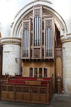 The earliest organ was obtained in 1846[31] and had formerly stood in the church of St Benet Fink, Threadneedle Street, London;[32] it had been manufactured in 1714 by Abraham Jordan. In 1938 a new organ was provided by Henry Willis, which had formerly been owned by Sir George Alfred Wills, Baronet of Bristol.[33] Eventually it too was replaced.