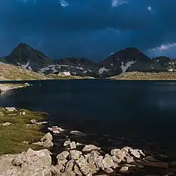 Tevnoto Lake is the largest and northernmost of the group, located in the immediate vicinity of the summits of Momin Dvor and Valyavishki Chukar.[4] It has an elongated curved shape slightly resembling a kidney. Reaching length of 487 m, width of 220 m and area of 62,490 m2, it is the eight largest lake in the mountain range and largest one in Bulgaria above 2,500 m. Its exact altitude is 2,519 m, which makes it the sixteenth highest lake in Pirin. The depth is 3.9 m; the water volume is 116,570 m3.[4][5] The homonymous Tevno Ezero shelter is situated near the out-flowing stream to the south.[4][6] Its natural beauty and majestic surroundings of rugged peaks make it a popular tourist destination.[6]