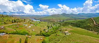 An aerial view of a village located in the Maloti Mountain range.