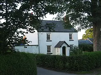 The building is constructed of rendered brick with a slate roof in two storeys and with a symmetrical two-bay front. In the centre is an open gabled porch. The windows are 12-pane sashes. At the rear is a large stairlight.[1]