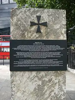 The Malta George Cross Memorial, also known as the Maltese Memorial, is a war memorial in London. It was erected to commemorate the siege of Malta in the Second World War, which led to the island's being collectively awarded the George Cross in April 1942. Unveiled in 2005, it stands near the church of All Hallows-by-the-Tower.