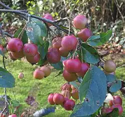Malus × robusta, called Siberian crab apple along with other members of its genus, is a hybrid species of flowering plant in the family Rosaceae.[1] It is the result of a cross between Malus baccata (Siberian crab apple) and Malus prunifolia (plum-leaved crab apple).[2] It is being studied for its resistance potential to fire blight.[3] Known for its attractive fruit that remain on the tree well into winter, its cultivar 'Red Sentinel' has gained the Royal Horticultural Society's Award of Garden Merit as an ornamental.[4]