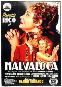 Malvaloca is a 1954 Spanish drama film directed by Ramón Torrado and starring Paquita Rico, Peter Damon and Antonio Riquelme. It is an adaptation of the 1912 play of the same title about a fallen woman from Málaga who eventually redeems herself.[1][2]