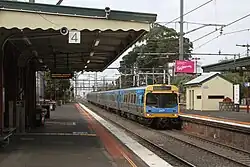 Malvern railway station is a commuter railway station that is part of the Melbourne railway network in Victoria, Australia.[2] The station is located on the southern border of Malvern, a suburb of Melbourne, and was opened on 7 May 1879. The station complex consists of an island platform and two side platforms all accessed by a pedestrian bridge. There are two red brick Edwardian-era station buildings, constructed in 1914 as ticketing and staff offices. The entire complex is listed on the Victorian Heritage Register because of its architectural significance and its role in the development of Malvern as a significant metropolitan centre.[3][4] The station is only partially accessible because of multiple steep access ramps.