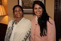 Banerjee previously served twice as Minister of Railways, the first woman to do so.[15] She is also the second female Minister of Coal, and Minister of Human Resource Development, Youth Affairs and Sports, Women and Child Development in the cabinet of the Indian government.[16] She rose to prominence after opposing the erstwhile land acquisition policies for industrialisation of the Communist-led government in West Bengal for Special Economic Zones at the cost of agriculturalists and farmers at Singur.[17] In 2011, Banerjee pulled off a landslide victory for the AITC alliance in West Bengal, defeating the 34-year-old Communist Party of India (Marxist)-led Left Front government, the world's longest-serving democratically elected communist-led government.[18][19][20]