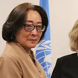 After graduation, Mizutori joined the Japanese Ministry of Foreign Affairs,[2] where she worked for twenty-seven years, serving among other positions as Budget Director,[3] Director of the United Nations Policy Division, the National Security Policy Division, and the Status of US Forces Agreement Division and Director of the Japan Information and Culture Centre at the Japanese Embassy in London.[1][3][4] In 2011 Mizutori became Executive Director of the Sainsbury Institute for the Study of Japanese Arts and Cultures at the University of East Anglia, in England.[1][3][5] She has also taught courses at Ritsumeikan Asia Pacific University and Waseda University,[1][3] has been published and advised think tanks on current affairs, and is a member of the UK-Japan 21st Century Group, which makes annual recommendations to the Prime Ministers of the two countries.[5][3]