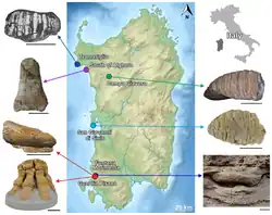 Most finds of M. lamarmorai were discovered on the west coast and in the western part of the island of Sardinia, and mainly comprise individual finds, but also belong to associated skeletal elements. The most important fossils are from Funtana Morimenta, a quarry south-southwest of Gonnesa in the valley of Rio Morimenta where it had already been discovered at the end of the 19th century. These fossils embedded in the Funtana-Morimenta lineup, which is composed of aeolian sedimentary formation that is located below a layer of strata dominated by a rock unit of conglomerates (the Tyrrhenian conglomerate). This rock formation is widely spread all over the west coast of Sardinia and is generally attributed to the last interglacial period that bears in northern Alpine region the term Eemian (126000–115000 years ago). The finds include mainly elements of the spine and musculoskeletal system, so among other things, a full foot, nearly complete hand, humerus and ulna, as well as remains of tusks. All discoveries are most likely to belong to a single individual. Other finds are known from San Giovanni di Sinis near Oristano, where a molar tooth was found in also deposited before the Eemian sediments, as well as an additional molar from Campu Giavesu in Sassari, which is, however, significantly larger. Finds from the Upper Pleistocene, which comprise a plurality of teeth, are mainly from Tramariglio near the city of Alghero.They also came from sediments deposited by wind, but these come from above the Tyrrhenian conglomerate.[6]