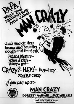 Man Crazy is a 1927 American silent comedy film directed by John Francis Dillon and written by Dwinelle Benthall, Rufus McCosh, and Perry Nathan. The film stars Dorothy Mackaill, Jack Mulhall, Edythe Chapman, Phillips Smalley, Walter McGrail, and Ray Hallor. Man Crazy was released on November 27, 1927, by First National Pictures.[1][2][3]