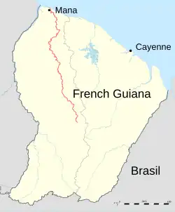 The Mana (French pronunciation: [mana]) is a river in western French Guiana. It runs north from central French Guiana to the town of Mana, where it flows into the Atlantic Ocean. It is 462 km (287 mi) long.[1]