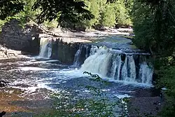Manabezho Falls is a waterfall on the Presque Isle River and is located in the Porcupine Mountains Wilderness State Park in Gogebic County, Michigan. With a drop of approximately 25 feet and a crest of 150 feet, it is the largest of the waterfalls on the river. It is below Manido Falls and Nawadaha Falls. The name Manabezho refers to an Ojibway spirit god. A view of the falls is easily accessible by trail.