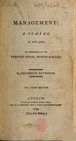 Management is a 1799 comedy play by the British writer Frederick Reynolds. It premiered at the Theatre Royal, Covent Garden in London on 31 October 1799.[1] The original cast included William Thomas Lewis as Captain Lavish, John Fawcett as Mist, Joseph Shepherd Munden as Worry, Alexander Pope as Sir Hervey Sutherland, Charles Farley as Alltrade, Charles Klanert as Frank, Samuel Simmons as Stopgap, George Davenport as Geoffrey, Mary Ann Davenport as Mrs Dazzle and Maria Ann Pope as Juliana. The Dublin premiere was at the Crow Street Theatre on 13 February 1800.[2]