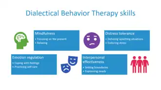 Dialectical behavioral therapy is a branch of cognitive behavioral therapy aimed at helping individuals to "accept the reality of their lives".[37] Therapists use strategies such as behavioral therapy techniques and mindfulness to address thoughts and behaviors, and help individuals to regulate and change these. It is usually recommended and used in patients with borderline personality disorder and other personality disorders which are difficult to treat. The specific skills focused on are mindfulness, distress tolerance, interpersonal effectiveness, and emotional regulation.[38] The main goal of DBT is to help clients manage their treatment and better understand their symptoms. The focus of DBT for PTSD is the future and adapting to the symptoms of the trauma.