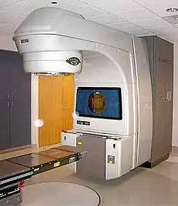 External beam radiation therapy (EBRT) uses a linear accelerator to produce high-energy x-rays that are directed in a beam towards the prostate. A technique called Intensity Modulated Radiation Therapy (IMRT) may be used to adjust the radiation beam to conform with the shape of the tumor, allowing higher doses to be given to the prostate and seminal vesicles with less damage to the bladder and rectum. External beam radiation therapy is generally given over several weeks, with daily visits to a radiation therapy center. New types of radiation therapy such as IMRT have fewer side effects than traditional treatment. However, in the short term, EBRT has been associated with acute worsening of urinary obstructive and bowel symptoms. These symptoms have been shown to decline over time.[7] Thirty-Six centers in the United States are now using proton therapy for prostate cancer, which uses protons rather than X-rays to kill the cancer cells.[24] Researchers are also studying types of stereotactic body radiotherapy (SBRT) to treat prostate cancer
