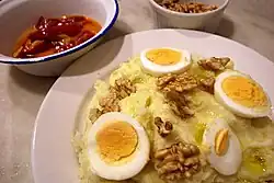 Like most Spanish cuisine, many local dishes contain garlic, including tiznao (salt cod with spring onions) and atascaburras[4] (salt cod with mashed potatoes, also called ajoarriero[5]). Additionally, the ñora, a cultivated version of the Capsicum annuum pepper from Valencia,[6] is often used in local dishes such as manitas de cerdo (pig's feet) and migas.[7]