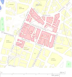 The area was a patchwork of mostly Victorian buildings on a 17th and 18th century layout of streets, alleys, and courts.[25] A map used for the 1961 meeting of the British Association shows shops fronting Market Street and Cross Street, with warehousing or office buildings behind.[31]