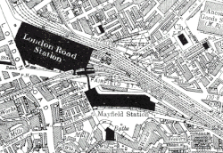 In 1910, the adjacent Mayfield station opened with four platforms to alleviate overcrowding at London Road. The stations were linked by a footbridge.[18] Mayfield station closed to passengers in 1960 and to all traffic in 1986. The derelict station has remained in situ despite proposed redevelopment schemes including reopening it to relieve demand.[19] In October 2013 the station's roof/canopies were demolished due to safety concerns.