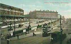 The station is unusual in having seen two different systems of overhead railway electrification: The first electrified line into London Road was the MSJA&R line to Altrincham, a busy commuter route. It was electrified with overhead lines, energised at 1,500 V DC in 1931. London Road was the terminus of the electrification scheme which ran through to the through platforms.[20]