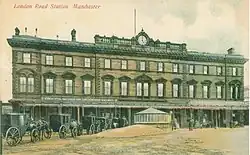 In 1847, the station was renamed London Road.[13] In 1849 the Manchester, South Junction and Altrincham Railway (MSJA&R) began using the station after its line from Manchester Oxford Road was extended. Its single platform which opened on 1 August 1849 to the south of, and adjacent to the main part of station, was the predecessor of through platforms 13 and 14. The MSJA&R's line connected to the main line south of the station and formed a through route to the LNWR's line to Liverpool.[12][15]