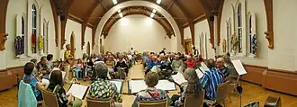 In 2008 two members of the society who played together as the Messey Fargusons (a word play on the name of a local farm implement company), took up mandolins and each year thereafter performed as a duet in the spring concert.[29] That year, as well as its usual concert and participation in the In From the Cold fundraiser, the Mandolin Society took part in Folkways Sundays at Lang Pioneer Village, playing music from the 19th century for passing tourists and history buffs.[30] The orchestra also provided inspirational music at a meeting of the Peterborough Unitarian Fellowship,[31] participated in a concert in support of the Ontario Music Centre summer camp,[32] and later performed as part of "Alley Waltz 2008: Counting the Ways", a production of Peterborough's Disappearing Theatre.[33] Practices in 2008 were moved to Sadleir House.