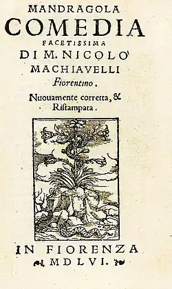 The Mandrake (Italian: La Mandragola [la manˈdraːɡola]) is a satirical play by Italian Renaissance philosopher Niccolò Machiavelli. Although the five-act comedy was published in 1524 and first performed in the carnival season of 1526, Machiavelli likely wrote The Mandrake in 1518 as a distraction from his bitterness at having been excluded from the diplomatic and political life of Florence following the 1512 reversion to Medici rule. Some scholars read the play as an overt critique of the House of Medici; and some scholars assert that the play is a mirror to his political treatises.[1] However, Machiavelli set the action in 1504 during the period of the Florentine Republic in order to express his frustrations without fear of censure from patrons already ill-disposed towards him and his writing.[2]