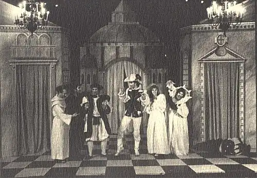 The Mumeijuku[7] Company performed La Mandragola, un Fiore Velenoso at the Sunshine Theater[8] of Sunshine-City[9] in Ikebukuro, Tokyo in 1981, starring Koji Yakusho[10][11] as Callimaco and Tatsuya Nakadai[12] as Nicia.[13] This run was directed by Mrs. Kyoko Nakadai, a.k.a. Ms. Tomoe Ryu,[14] who has won the National Arts Festival (sponsored by the Agency for Cultural Affairs Japan) Excellence Award for directing Henrik Johan Ibsen's The Master Builder, Solness in 1980.[15]