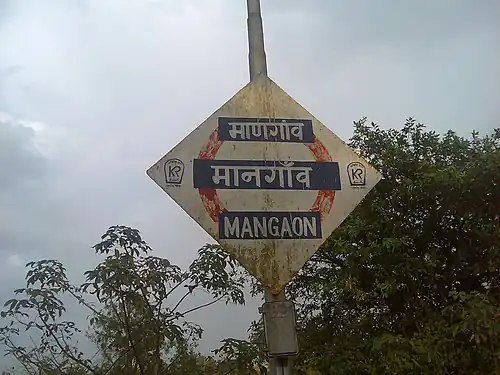 Mangaon railway station is a station on Konkan Railway serving the town of Mangaon in the Raigad district of Maharashtra. It is at a distance of 30.6 km (19.0 mi) down from origin. The previous station on the line is Indapur railway station, a halt station, and the succeeding station is Goregaon Road railway station, also a halt station.[1]
