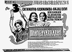 - ^ "1949 – மங்கையர்க்கரசி – பாக்யா பிக்சர்ஸ்" [1949 – Mangayarkarasi – Bhagya Pictures]. Lakshman Sruthi (in Tamil). Archived from the original on 25 May 2017. Retrieved 26 May 2017.