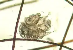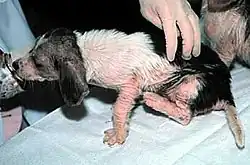 Mange (/ˈmeɪndʒ/) is a type of skin disease caused by parasitic mites.[1] Because various species of mites also infect plants, birds and reptiles, the term "mange", or colloquially "the mange", suggesting poor condition of the skin and fur due to the infection, is sometimes reserved for pathological mite-infestation of nonhuman mammals. Thus, mange includes mite-associated skin disease in domestic mammals (cats and dogs), in livestock (such as sheep scab), and in wild mammals (for example, foxes, coyotes, cougars,[2] Tasmanian devils,[3] and wombats[4][5]). Severe mange caused by mites has been observed in wild bears.[6] Since mites belong to the arachnid subclass Acari (also called Acarina), another term for mite infestation is acariasis.
