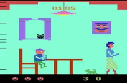 The joystick is used to control the player: pressing right causes the boy to grab a plate of pasta, pressing left causes him to eat it, and pressing up or down causes him to toss the pasta to the cat (named Frankie in the manual) or the dog (named Sergio) respectively. If the cat and dog are not nearby when the food is thrown to them, the mother returns with extra pasta to "punish" the player. The fire button is not used.[5]