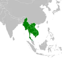 The species is native to Mainland Southeast Asia. Specifically, it is native to Thailand, Cambodia, Laos, Vietnam and Myanmar.[7] It occurs within monsoonal deciduous forests, savannas[a] and lowland tropical rainforests[4]