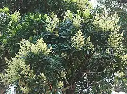 Panicles glabrous, erect, up to 20 cm (7.9 in) long, terminal. Flowers whitish and cream yellow coloured, 5–merous, 4 mm (0.16 in) across, not glomerulate. Bracteoles lanceolate, minute, caducous. Pedicel slender, 1 mm (0.04 in). Petals twice as long as sepals. Sepals 5, ovate, acute, 2 mm × 1.5 mm (0.08 in × 0.06 in). Petals 5, elliptic, 3.5 x 2 mm. Disc large, cushion-like, with 5 globose lobes. 1 fertile stamen (rarely 2), 2 mm (0.08 in) long.